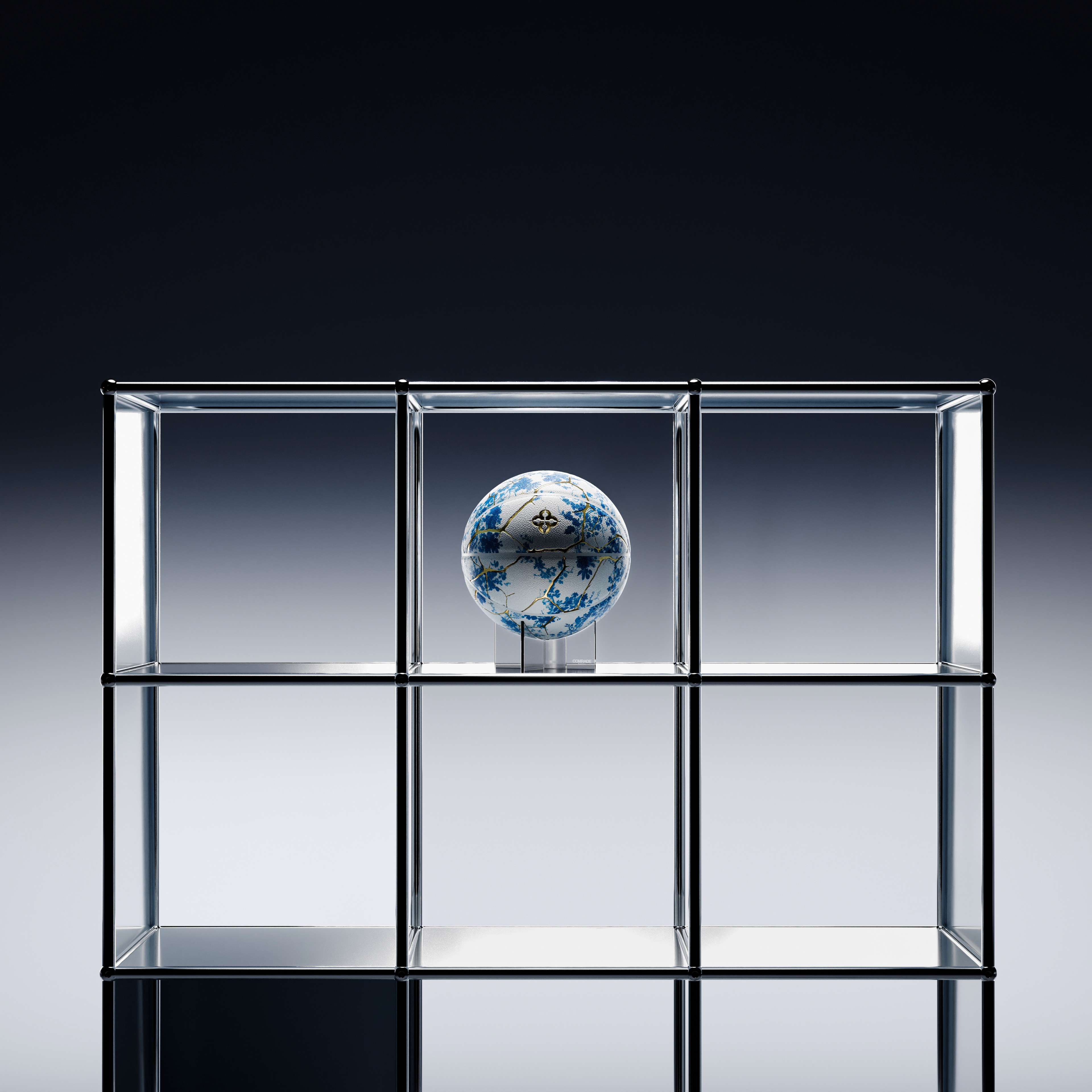 A high-contrast background with a soft blue gradient evokes the iconic “blue haze” of classic basketball photography. The USM shelf frames the product as an interior piece while perfectly fitting the brand’s aesthetic. I underlined the idea of kintsugi by assembling the shelf structure around the product.